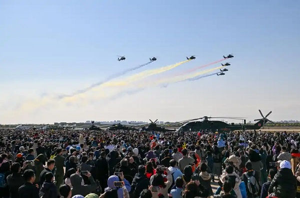 10月18日,直升機(jī)進(jìn)行飛行表演。當(dāng)天,第七屆中國(guó)天津國(guó)際直升機(jī)博覽會(huì)迎來(lái)首個(gè)公眾開(kāi)放日。新華社記者 孫凡越 攝